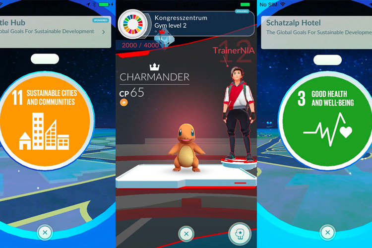 Globala Målen-kampanjen och utvecklaren till spelet Pokémon GO gick ihop för att skapa speciella platser i spelet för att öka kännedomen om målen hos deltagare vid World Economic Forum attendees.